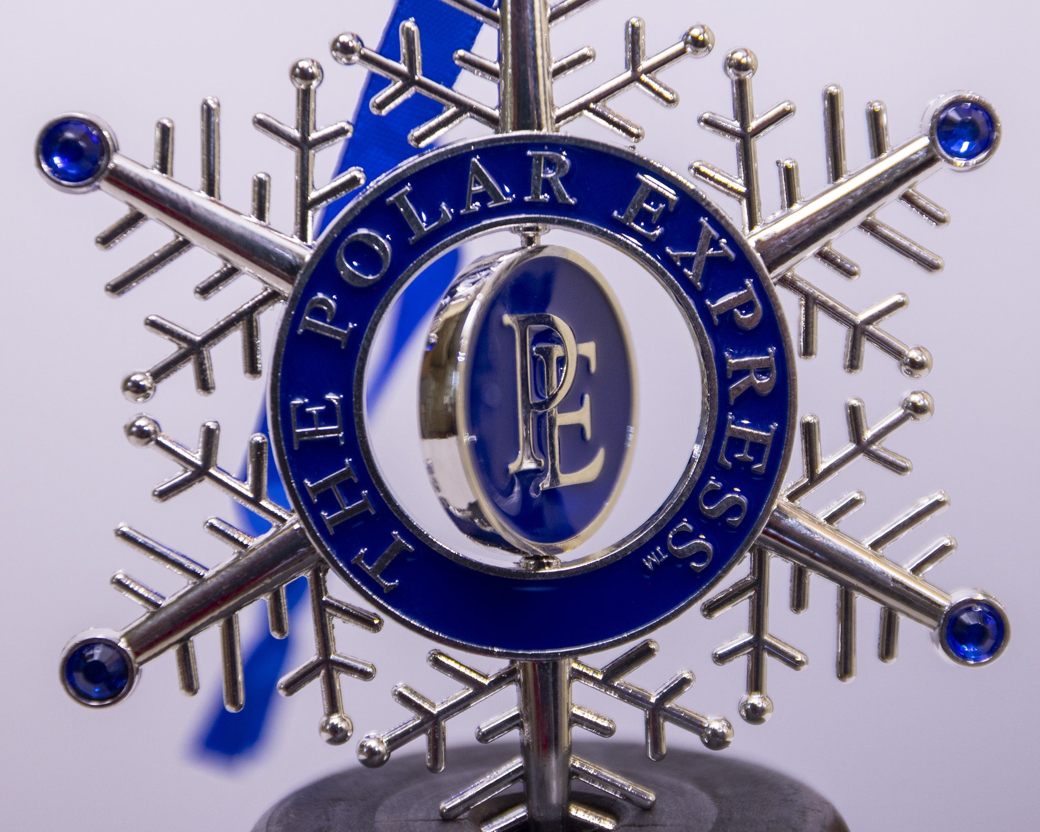 The Polar Express snowflake spinner ornament features a beautifully crafted snowflake with a spinning PE charm at its center.
